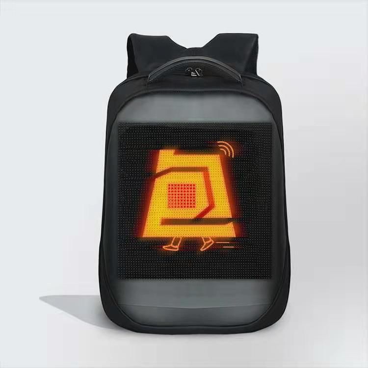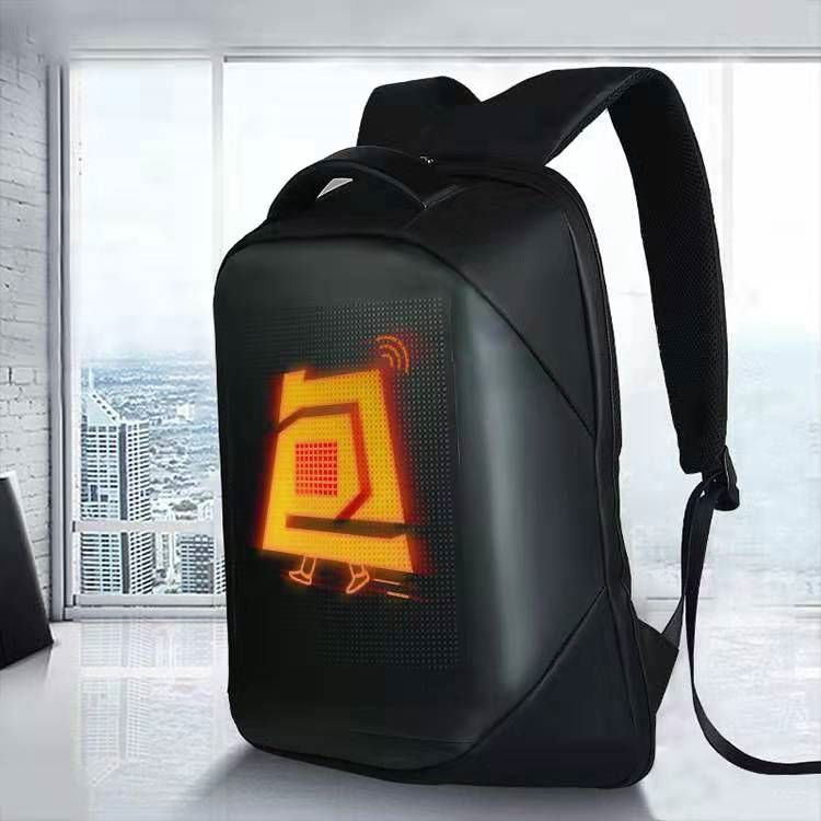 创业团队自主设计开发了一种新型的物联网设备——移动广告背包。这种背包采用一体化缝纫技术将一面显示屏镶嵌在背包正面,包内装有电池和 4G 通讯设备,并配有摄像头,与手机 APP 整合。其外观如下: