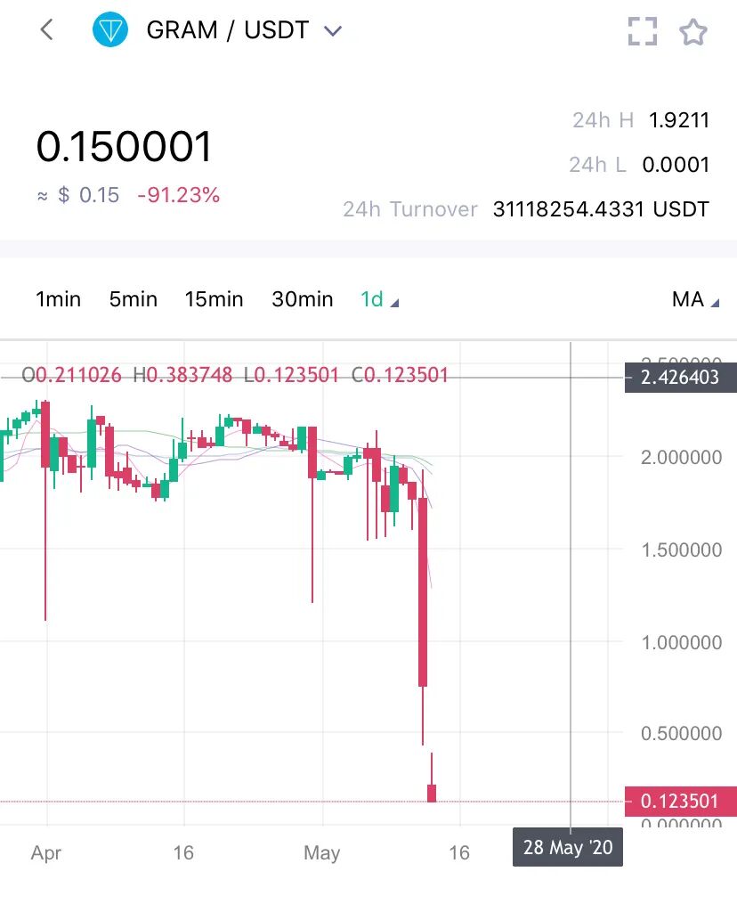 因为消息一出,各大交易所的GRAM期货代币应声大跌,以币夫Bitforex为例,截至发稿前,其期货GRAM已经从前一天的1.59美元跌为0.15美元,跌幅高达91%。