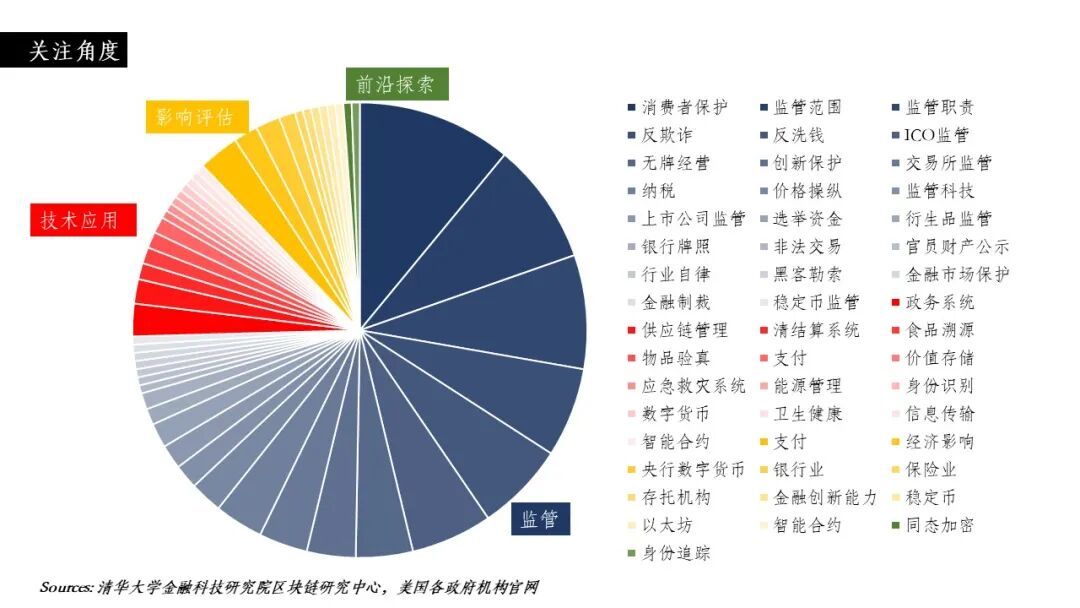 美国政府机构最关注的是区块链的监管问题,占总关注事件的74.4%。其次对区块链的技术应用和影响评估的关注度大致相当,分别是13.4%、11%。前沿探索在公开资料中信息很少,占比仅为1.2%。