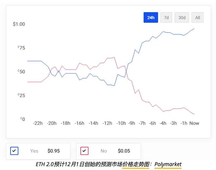 存款的激增让Polymarket的预测市场上,ETH 2.0的创世事件是否会在12月1日发生,出现了疯狂的波动,支持该事件的合约从12小时前的0.36美元跳涨到截至本文撰写时的0.95美元。