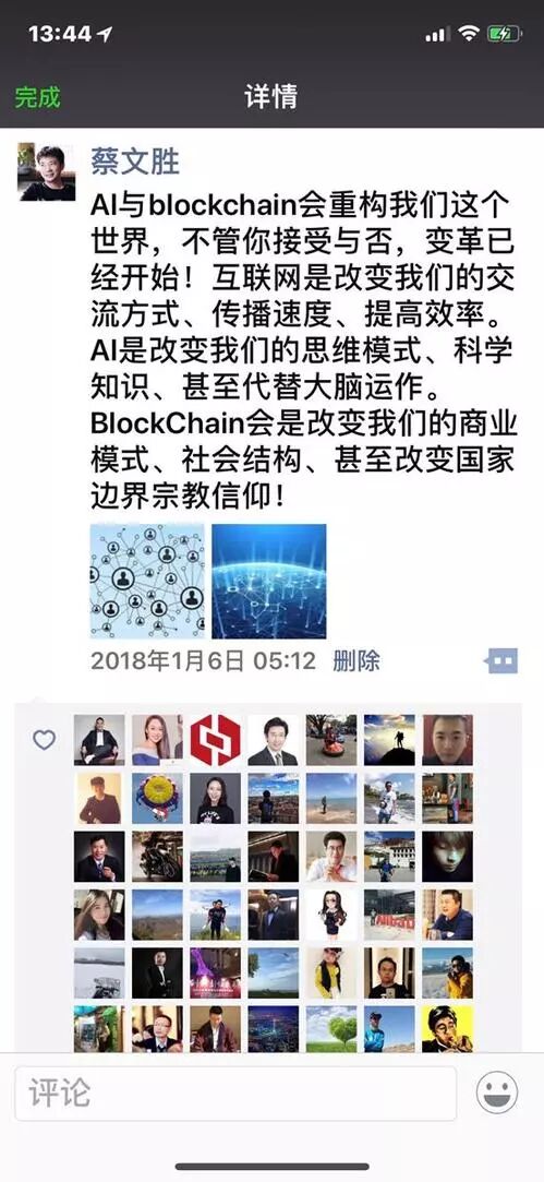 蔡文胜:我算比较早了解比特币,大概2011年就知道,在2014年投资okcoin,也买了第一块比特币,但可惜一直没有深入的投入。到2017年中,薛蛮子老师给我电话,要我投资区块链,我还劝蛮子说ICO有风险,不要太多参与。真正理解是2017年底,我见了很多区块链牛人,肖风、元道、吴忌寒、火星人等等,包括几个拥有数万比特币的人,和他们深入交流,更加理解区块链,也坚定认为区块链是未来。