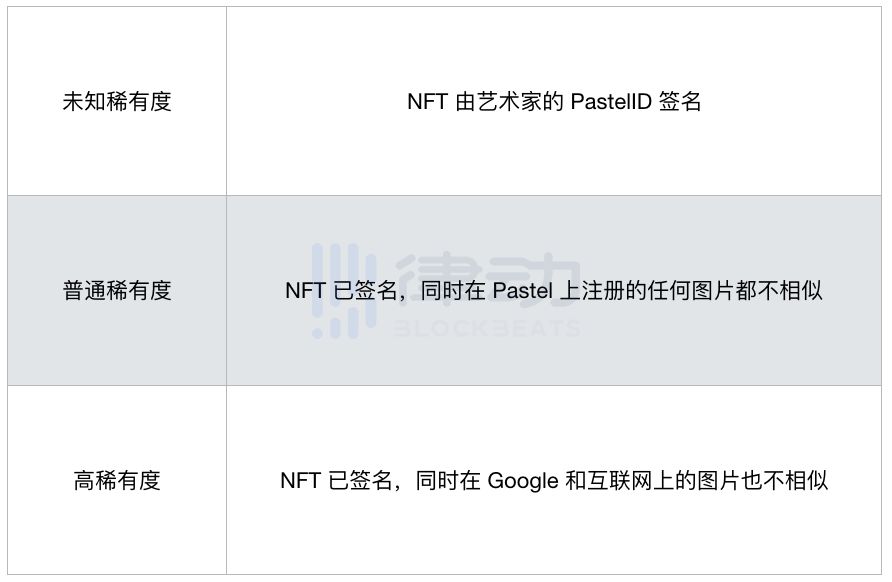 在 Pastel 网络中,作品通过是否有签名,是否有相似图片等因素被评为「未知稀有度」、「普通稀有度」,以及「高稀有度」,被评为「高稀有度」的作品,在某种意义上更为罕见,也可能代表着更高的价值。