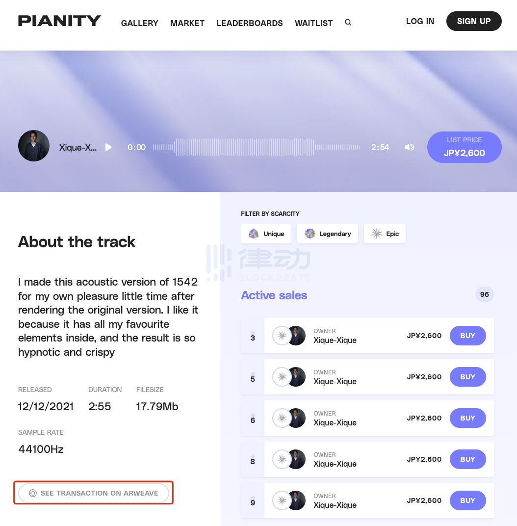 我们首先来到 Pianity 的首页,随机点开一个音乐 NFT。可以在点开后的详情页中试听歌曲,并浏览歌曲的基本信息。