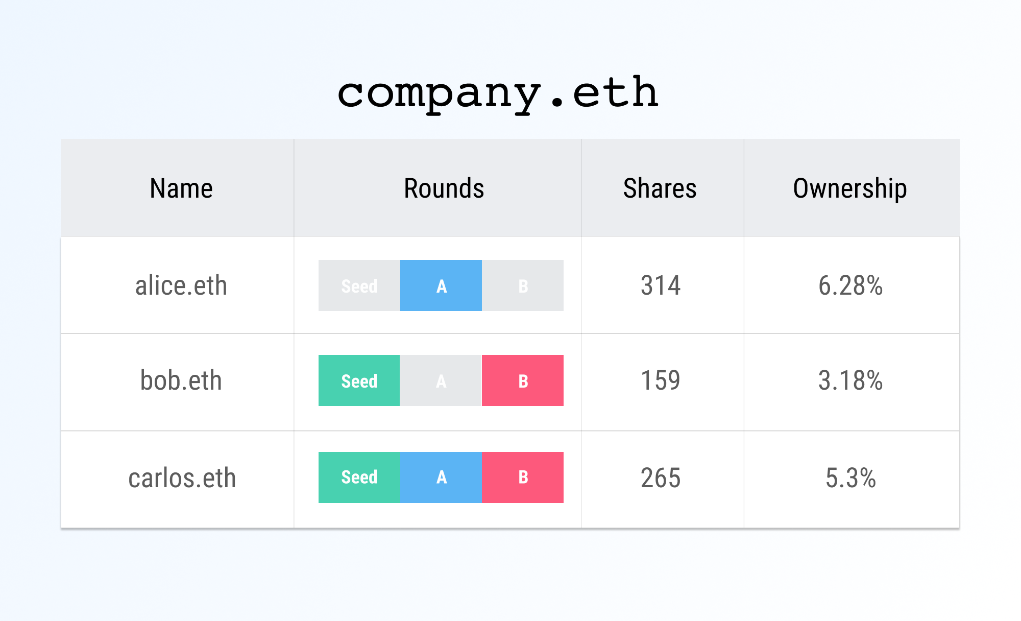 因为一个特定的公司通常将其所有的筹款过程保持在像Carta这样的单一平台的范围内,该平台可以很容易地将一个公司的主要资本构成表的镜像写入以太坊区块链,并在该公司的生命周期内维护它。然后,股东将收到镜像股份到他们的ENS地址。请注意,链外的资本表和相关的法律文件仍然是主要的法律目的;它们仍然是你用来遵守法律制度的东西。但是,Mirrotalbe将是每个人都会使用的东西。