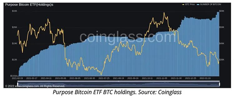 链上监测资源Coinlass的数据显示,在截至2月23日的两周内,Purpose比特币ETF的持有量从28854个BTC增加到32257个BTC — 11.8%。