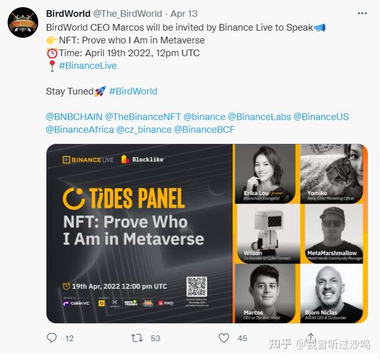 目前为止BirdWorld也引发了市场现象级的关注。在此之前BirdWorld已获得了美国软银集团的天使投资,新加坡数字商品基金会跟投200万美金。bitkeep钱包也因为看好其发展和BirdWorld展开了深度合作,向其社区用户详细介绍了BirdWorld。4月18日加密货币交易所Latoken也宣布战略投资AVG Gamefi应用BirdWorld(lab),它们也将帮助BirdWorld获得其全球用户的关注。刚刚结束的Binance Live “NFT:在元宇宙世界证明我是我”的主题直播上,BirdWorld的CEO也向Binance Live的用户以“从nft的效用和对Web3.0的价值赋能上共同探讨了NFT2.0的机遇和挑战”在主题讲述了BirdWorld全球策略。而关于NFT的讨论也一直持续到了和若干优秀NFT项目的圆桌会议。