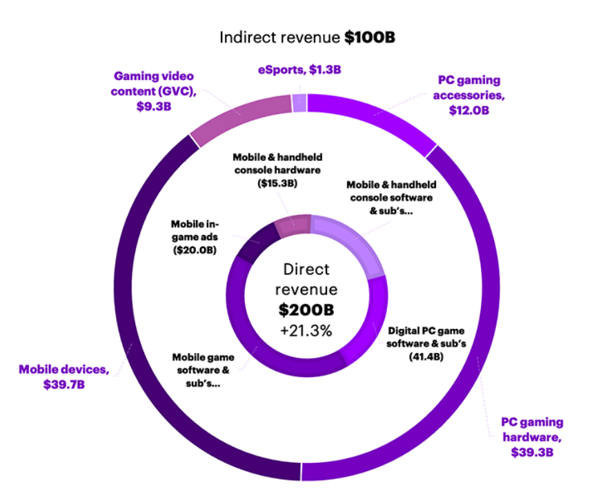 但这3000亿美元除了2000亿的直接收入(游戏软件、广告、订阅服务等)外,还包括了1000亿由游戏催生的非直接收入,这部分包括有电竞、游戏视频相关内容、PC外设等等。