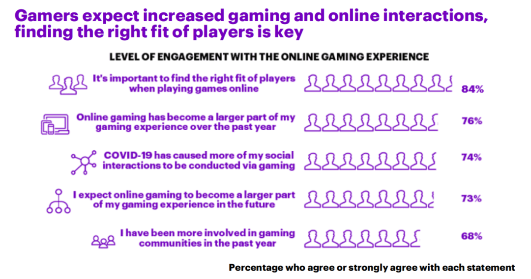 在线游戏中,有84%的玩家都认为找到合适的非常重要;有76%的玩家认为通过过去的一年,在线游戏已经成为生活中重要的一部分;有73%的玩家认为在未来在线游戏还会继续在他们生活中扮演重要角色。