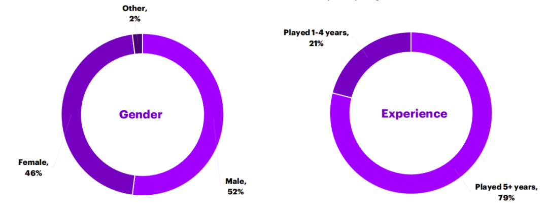 埃森哲的研究显示,大众眼中玩家都是年轻男性的传统印象早就大谬不然,由于移动设备的普及,如今女性玩家的比例(46%)已经快赶上男性玩家(52%),其中游戏年龄超过5年的玩家比例有79%,而只玩过1-4年的玩家比例有21%——这些新玩家的加入不仅是为行业带来增长,他们与老玩家不同的倾向和喜好也迫使着整个行业进行改变。