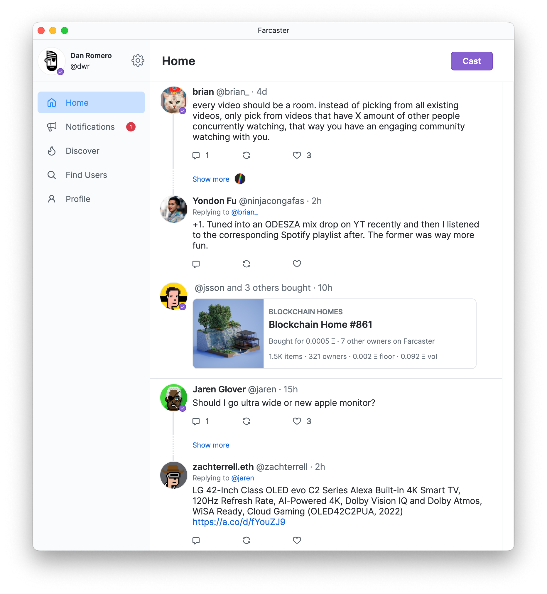 两年前,Dan 和其在 Coinbase 的同事 Varun 开始研究一个名为 RSS + 的概念。目标是打造一个可信的中立协议,使用者可以与受众直接建立关系,开发人员可以在无需许可的情况下自由地创建客户端。经过几次迭代后,终于打造出了 Farcaster,一个用于构建社交网络的充分去中心化的协议。