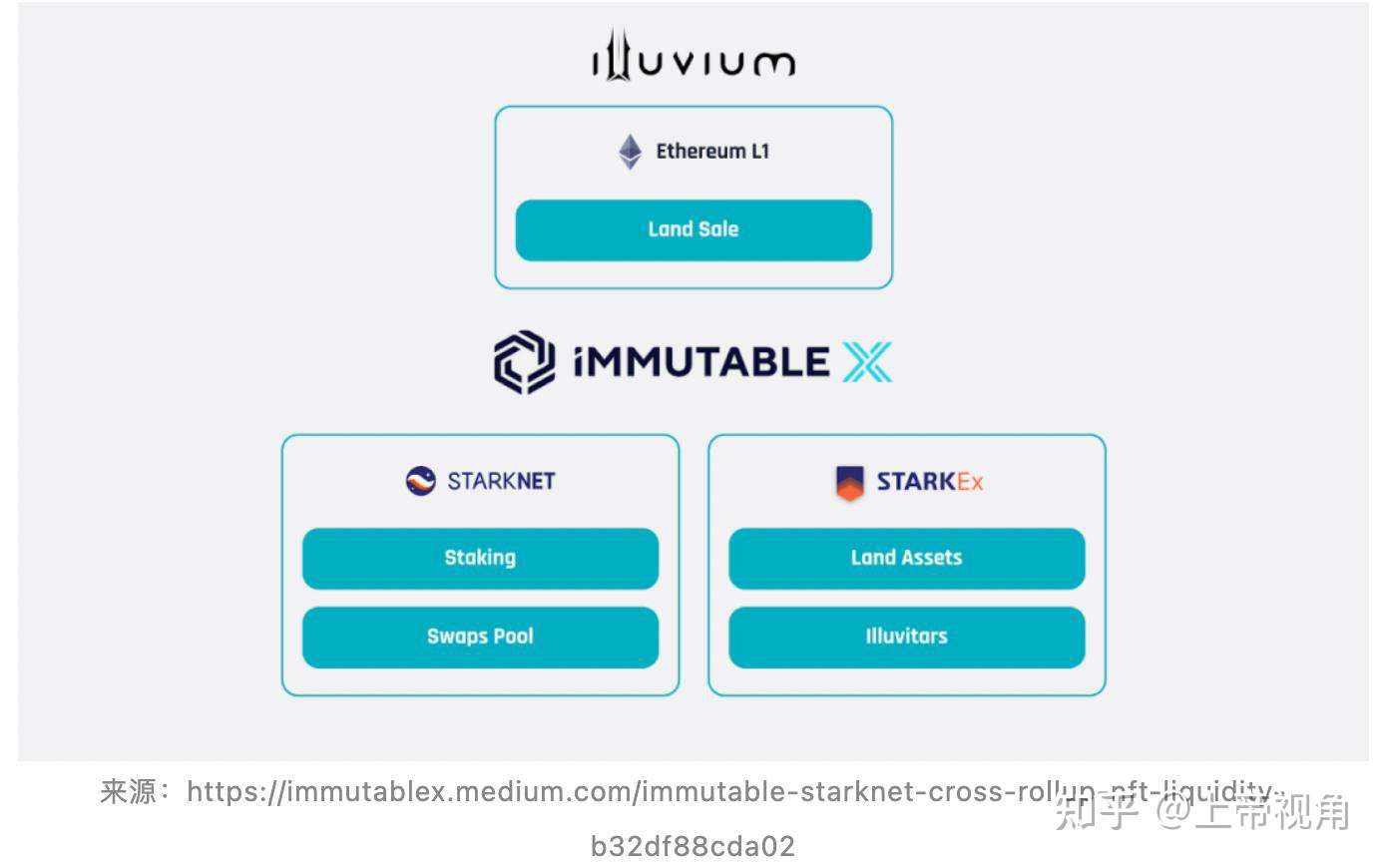 有趣的是,IMX建议项目方可以选择在不同的链上实现不同的功能,以Illuvium为例,在L1主网进行土地发售,在StarkEx提供服务的IMX上实现头像(Illuvitars)发售等功能,而质押、交易池则将会部署在StarkNet上[3]。