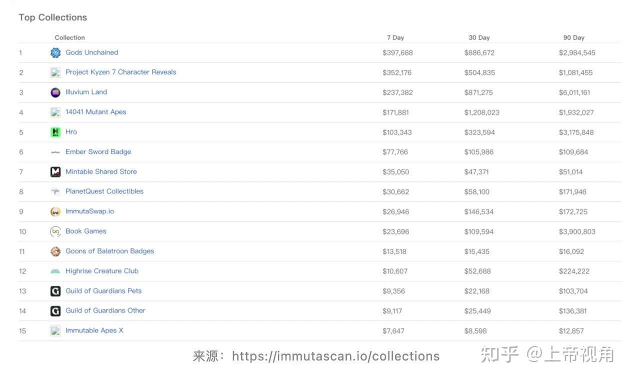 下图展示了IMX按近7日交易量排名前15的项目,其中#1 Gods Unchained、#3 Illuvium、#6 Ember Sword、#8 PlanetQuest、#13#14 GOG均是IMX官方推介的游戏项目。