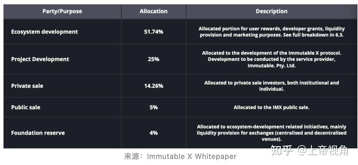 在$IMX的分配中,~51.74%归属生态发展,包括用户质押激励、开发者资金、营销等;25%归属协议本身用于开发运营;~14.26%归属私募;5%在公募中售出;4%归属基金会留存,用于提供交易所流动性等。