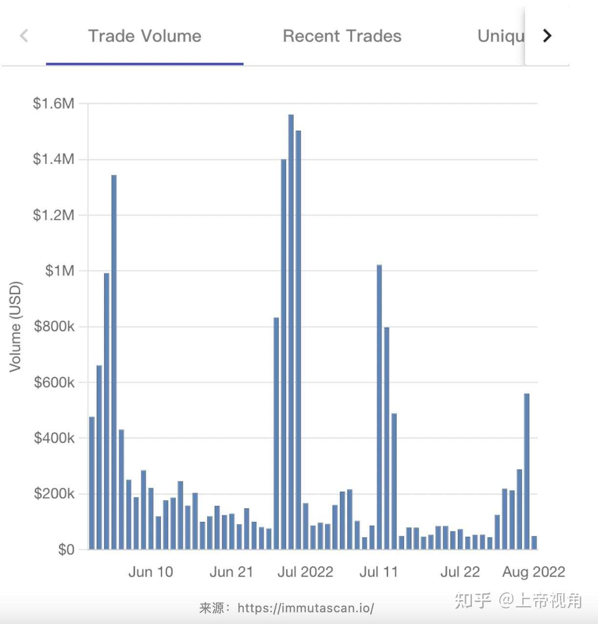 再来看营收侧:IMX提供的浏览器上展示了近两个月的所有NFT交易额,官网中每个数据点都有精确数值,统计可得近两个月交易额总计~1,800万美元,日均30万美元,按2%的税收每日可收取6,000美元,对比日均280美元的补贴开销绰绰有余。当然,这里的2%是未来的规则,实际上整个6月是按1%收取的,7月恢复2%税率;另外,目前只能根据近两个月数据来估算年化,无法根据更长周期的数据来推测趋势。