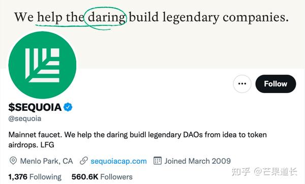目前不少公司都在推崇DAO,有个有趣的小事情和你分享下,2021年12月8日,红杉资本在社交平台推特上,把公司的简介里的单词company改成了DAO,这一举动在国内外都引发了不少热议,甚至有自媒体大V积极转发,不过,后来红杉资本把DAO简介改掉了,从此事件不难看出,头部企业是看好DAO的管理方式的。