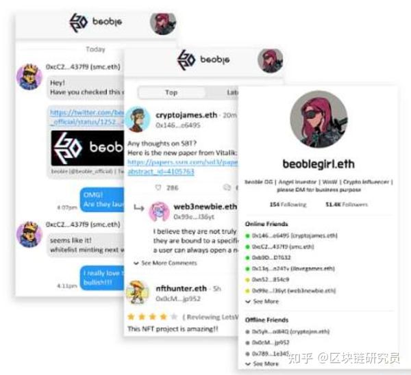不同于Swapchat主打跨平台的应用功能,Beoble则是将社交功能做成了API和SDK,让任何项目方能轻易快速的接入并完善自己的社交场景。其提供了包括个人Profile、Feed流、即时私聊在内的模块化功能,对于想要做自己社交生态的游戏方/项目方而言会是个十分趁手的工具。