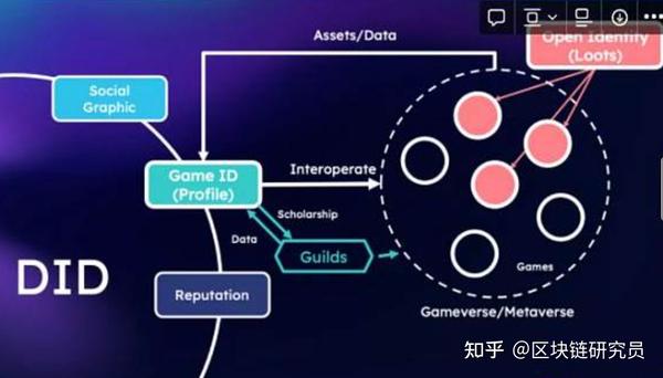 而想要做到这一点,就需要玩家拥有一个通用的身份格式,即游戏版的DID,其记录着玩家在各个游戏中的经历、声誉、资产和成就,同时由于去中心化身份的通用性,该身份所关联的社交关系也可以自由的带入到不同的游戏中,这里我们将这种DID称为GameID,其与其他的身份数据构成了用户完整的DID形象。