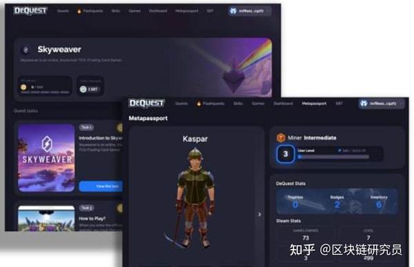 DeQuest是一个从Quest系统切入的GameID平台,其做了非常有意思的游戏化设计,使用户的GameID以虚拟形象的形态呈现(未来可使用该形象进入sandbox),在完成任务的过程中可以解锁装备和技能。