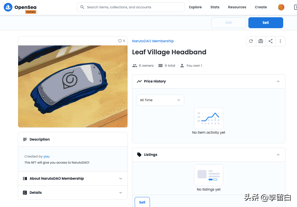 很好!在这里你会看到我的 NFT 有“6 个所有者”。您还会看到它说“您拥有 1”,只要您铸造了一个,您就会看到它!