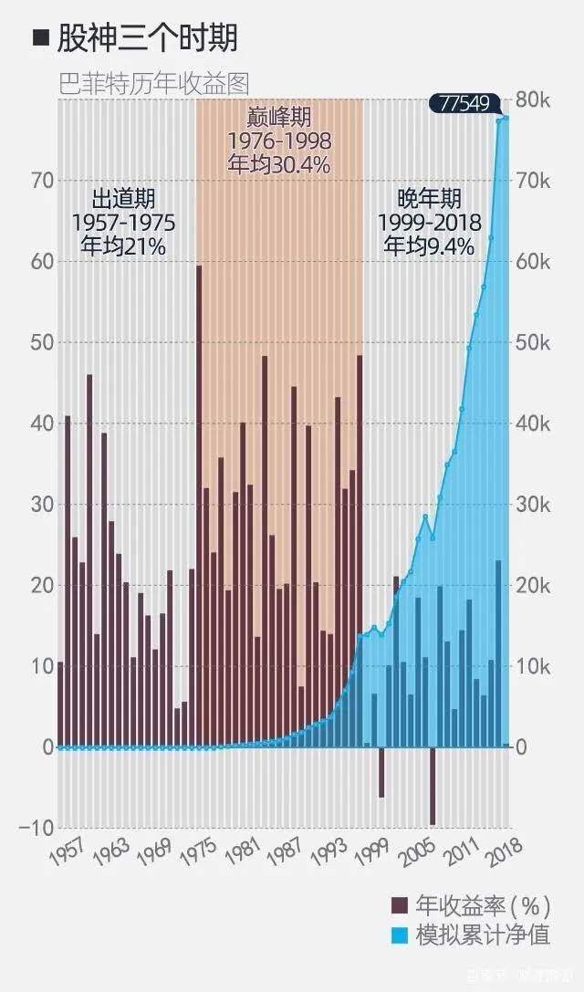 自 2000 年左右,互联网成熟以后,商业价值创造进入了新范式:网络效应成为了主导。过去 20 年里,绝大部分的市值增长来自于科技公司,而这些科技公司拥有 1 个或者多个网络效应。技术领先带来的网络效应成为了最强的护城河,超越了品牌效应,不投资科技股的巴菲特收益率也开始跑输标普 500指数(下图晚年期),而即使最近几年巴菲特对 Apple 的投资,个人认为更多是出于对苹果品牌的认可,仍然是品牌效应的范畴。