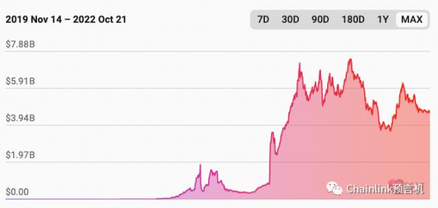 TVS 指预言机等关键基础设施所保障的市场中存入的以美元计价的资产总值。Chainlink 预言机向链上智能合约提供喂价、天气数据、体育比赛统计数据和储备金证明等数据。比如,截至 2022 年 10 月 17 日,Chainlink Price Feeds 为 Compound 保障了价值超过 10 亿美元的 stablecoin,而这些金额都被算进 Chainlink 的 TVS 中。