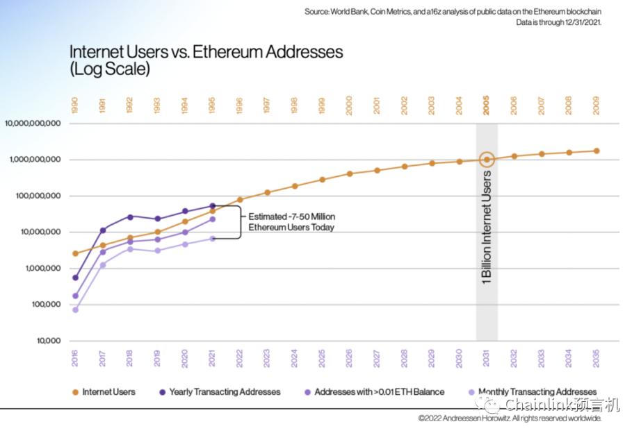 a16z 在名为「2022 State of Crypto」的报告中提到,目前以太坊预计有 700 万 -5000 万个活跃用户。因此,目前 Web3 的应用水平就比较接近 1995 年的互联网。以这个趋势来看,到 2031 年 Web3 用户将达到十亿,这是互联网在 2005 年的发展水平。