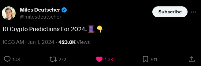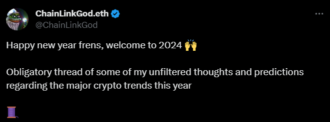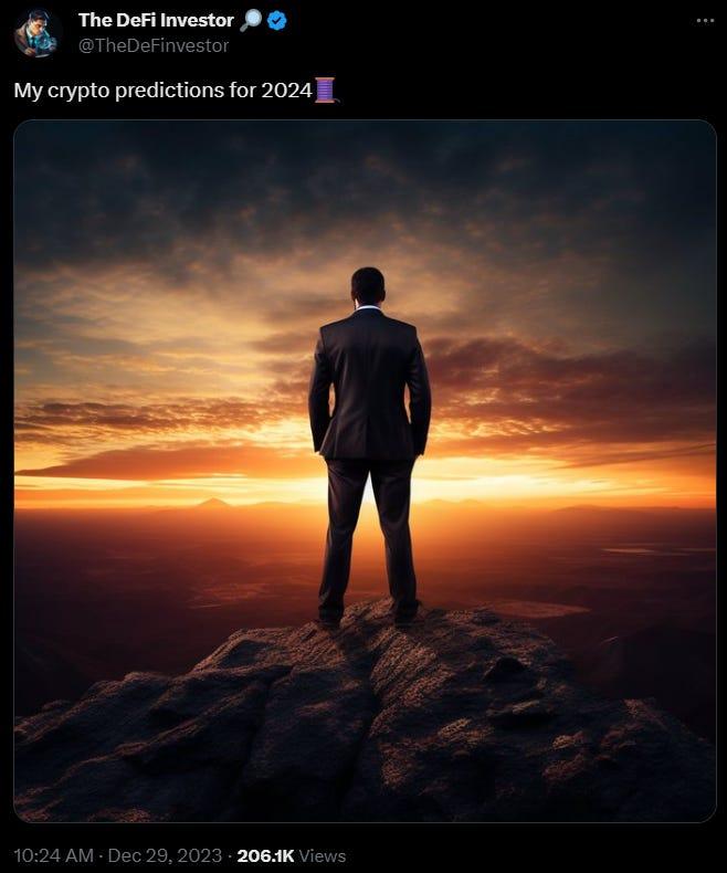 当然,我自己也有对2024年的预测。以下是我关于加密领域的9大预测,涵盖了从链上统计数据到更大的行业趋势,再到特定领域的预测。请享用!