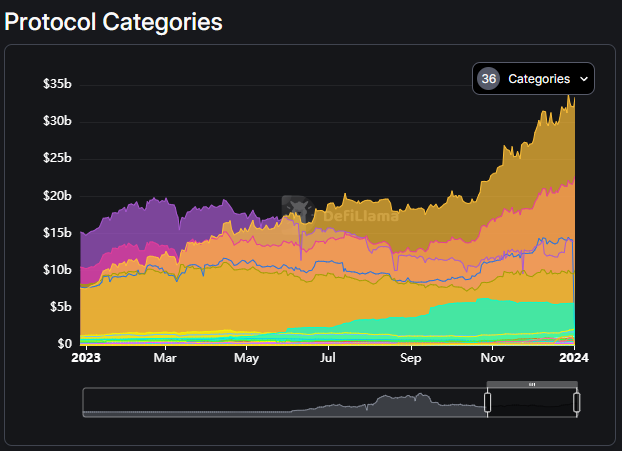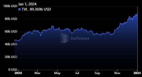 在2023年,DeFi的总TVL(包括流动性质押)从459亿美元大幅增长至894亿美元。对于一个经历了充满挑战的2022年的行业来说,这是一次显著的反弹。