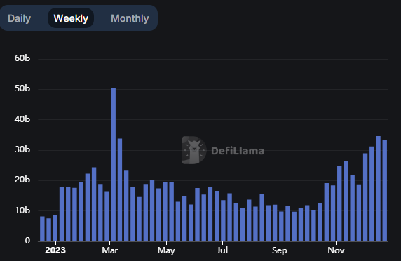 2022年年末,DEX的交易量降至多年低点,每周大约80亿美元。然而到了2023年年末,交易量上升了4倍,达到每周超过330亿美元。