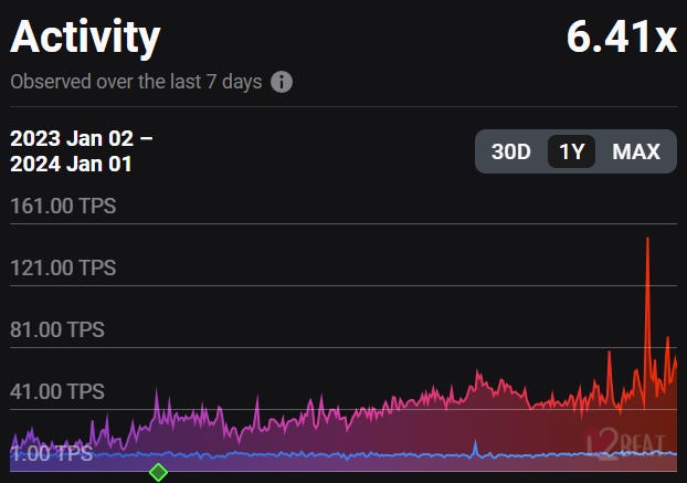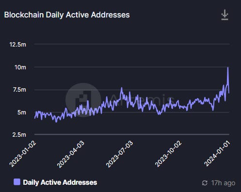 2023年初,日活跃区块链地址大约为400万个,到年底最后几天时,这一数字已经增长至每天超过800万个。