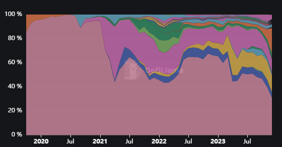 2023年1月,以太坊DEX的交易量占比约为65%,但到了12月已下降至30%。其中,Solana和Arbitrum分别以橙色和黄色表示,成为市场份额增长最快的平台。