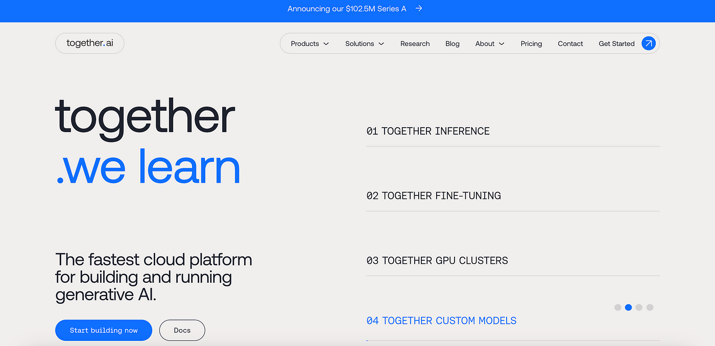 Together.ai运营着一个专注于为人工智能提供去中心化云服务的技术服务平台。他们的平台专门构建大型、用户友好和开源的模型。这有助于研究人员、开发者和公司通过一个直观的平台来利用和增强人工智能,这一平台涵盖数据、模型和计算。