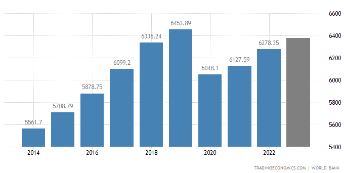 2022 年,泰国人均 GDP 为 6278.35 美元。泰国的人均 GDP 相当于世界平均水平的 50%。从 1960 年到 2022 年,泰国人均 GDP 平均为 2976.71 美元,在2019 年达到历史最高,为 6453.89 美元。