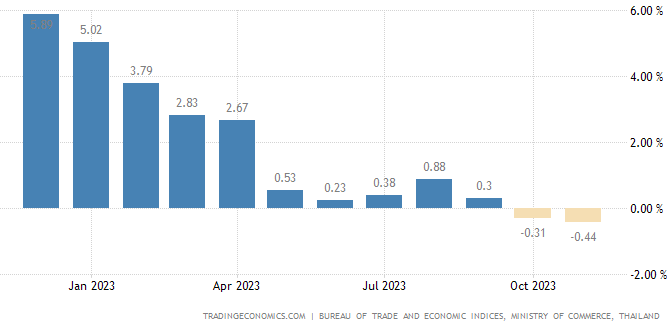 2023 年 12 月,泰国消费者价格同比下降 0.83%,这是继 11 月下降 0.44% 后的第三次通货紧缩,而预期为下降 0.3%。这也标志着34个月来最严重的通货紧缩,也是连续第8个月超出央行1%至3%的目标。主要贡献是政府措施导致能源价格下降,即电力和汽油价格下降。