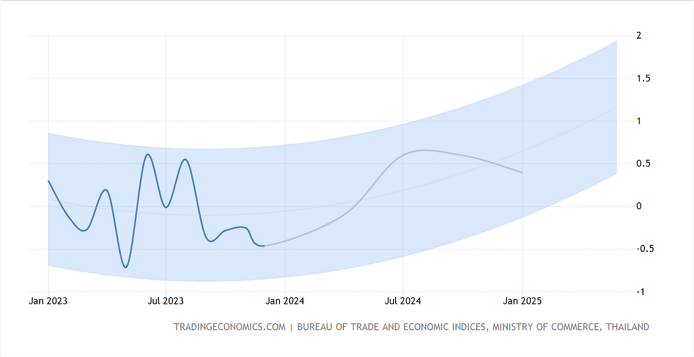 根据 Trading Economics 全球宏观模型和分析师的预期,到本季度末,泰国的通胀率环比预计为 -0.10%,从长远来看,泰国通胀率预计在 2024 年为 0.40% 左右,到 2025 年为 0.30% 左右。也就是说,如果政府没有强力措施进行改变,泰国的货币价值下降、经济持续萎缩以及由此导致的贫富差距加大,将会在2024年延续。