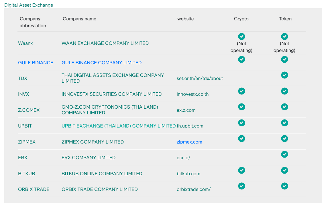根据泰国证券交易委员会的规定,有一份注册并获得许可的CEX名单,以下这些交易所被允许在泰国开展业务:
