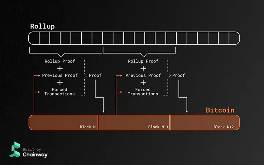 Chainway正在比特币的基础上建立一个zk rollup。Chainway rollup使用比特币L1作为DA层来存储rollup的zkp和状态差异。此外,rollup利用证明递归,使每个新证明聚合在前一个L1块上发布的证明。该证明还聚合了“强制交易”,即L2相关的交易,这些交易在L1上广播,以强制将其包含在L2上。这种设计有几个优点