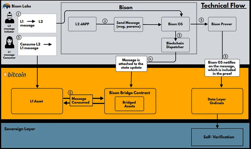 Bison的比特币L2采用主权rollup风格。Bison使用STARK实现zk rollup,并使用Ordinals将L2 TX数据和生成的zkp存储到L1。由于比特币无法在L1上验证这些证明,因此验证委托给在其设备中验证zkp的用户。