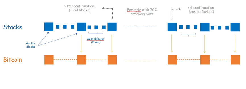 在Nakamoto Release中,Stacks中的区块是由在L1上以BTC进行保证金交易的矿工开采的。当Stacks矿工创建一个区块时,这些区块被锚定在比特币L1中,并接收L1 PoW矿工的确认。当一个区块收到150个L1确认时,这个区块被认为是最终确定的,如果不分叉比特币 L1,就无法分叉。在这一点上,开采该区块的Stacks矿工获得STX奖励,他们的BTC保证金被分发给网络Stackers。这样,任何超过150个区块(约1天)的Stacks区块都依赖于比特币L1安全性。对于较新的区块(