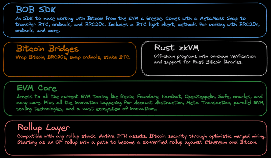 为了区别于其他同样支持WBTC和TBTC的以太坊L2, BOB正在构建允许用户直接从 BOB 与比特币 L1 交互的功能。BOB SDK提供了一个智能合约库,允许用户在比特币L1上签署交易。这些交易在 L1 上的执行由比特币轻客户端监控。轻客户端将比特币区块的哈希值添加到BOB中,以允许简单验证(SPV)提交的交易在L1上执行并包含在区块中。另一个特性是独立的zkVM,它允许开发人员为比特币L1编写rust应用程序。正确执行的证明可以在BOB rollup上进行验证。