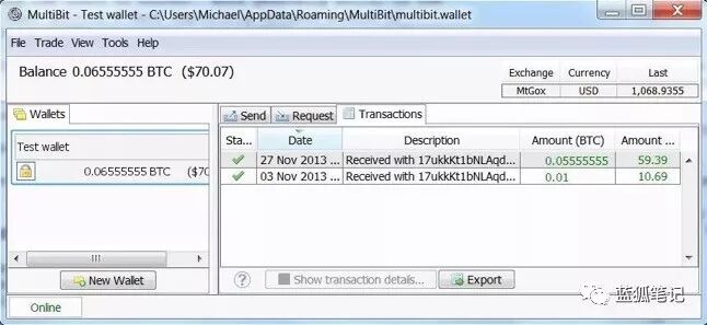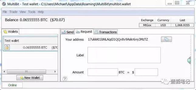 要在实践中使用比特币,您需要首先在计算机上安装钱包程序。为了让您了解这意味着什么,下面是一个名为Multbit的钱包截图。您可以在左边看到比特币余额 0.06555555比特币,或者在我截图当天的汇率大约70美元- 以及右边最近的两笔交易,其中存放了0.06555555比特币: